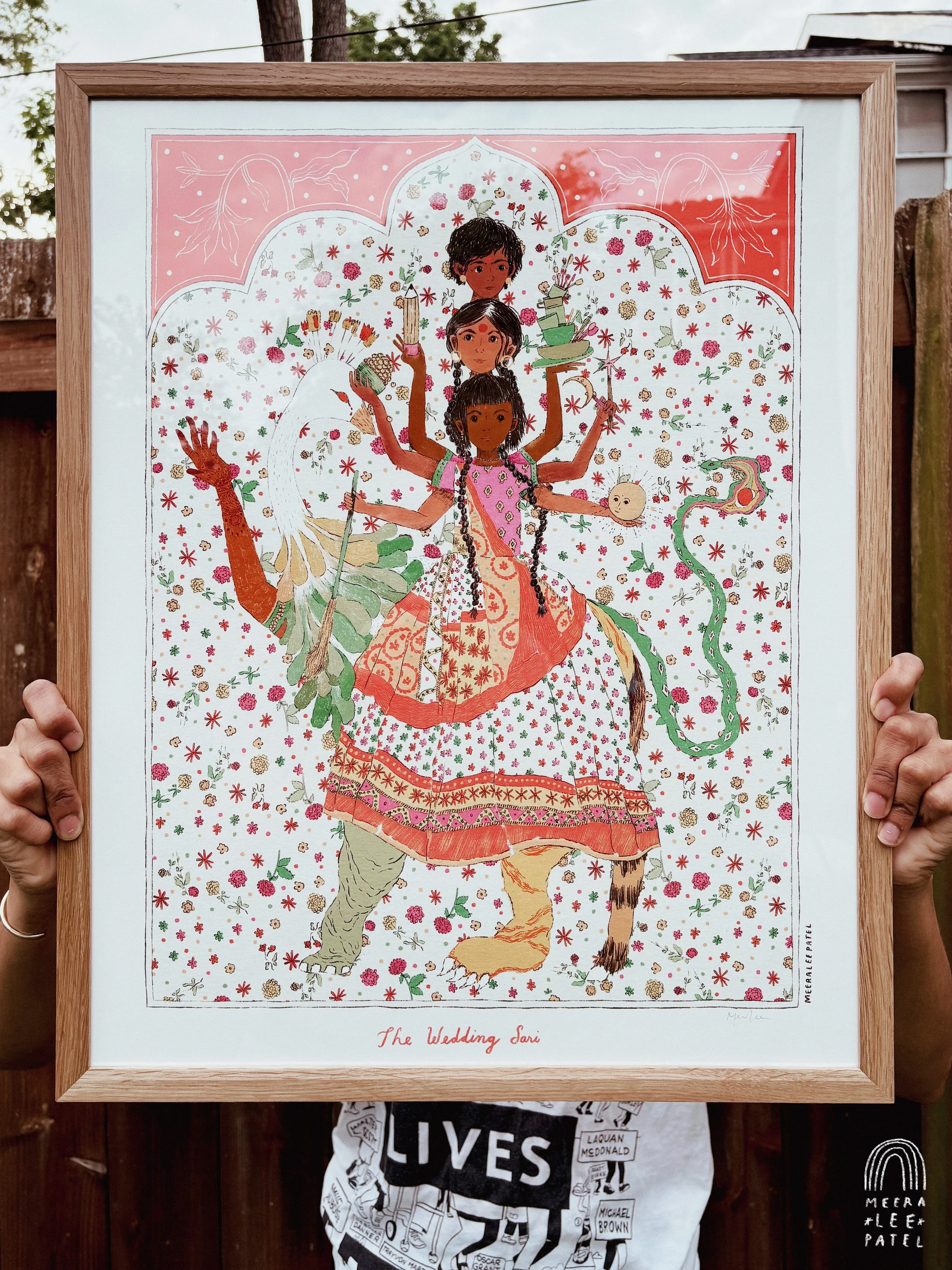 The extremely unassuming frame I ordered for The Wedding Sari finally came, so I framed this piece and am shipping it to my aunt this week. The Wedding Sari is an essay and illustration I created for my column, Being, in Issue #65 of Uppercase Magazine. It explores the history of the Gujarati panetar, or wedding sari, and the one I wore on my wedding day, which was previously also worn by my mother and her older sister, my aunt.